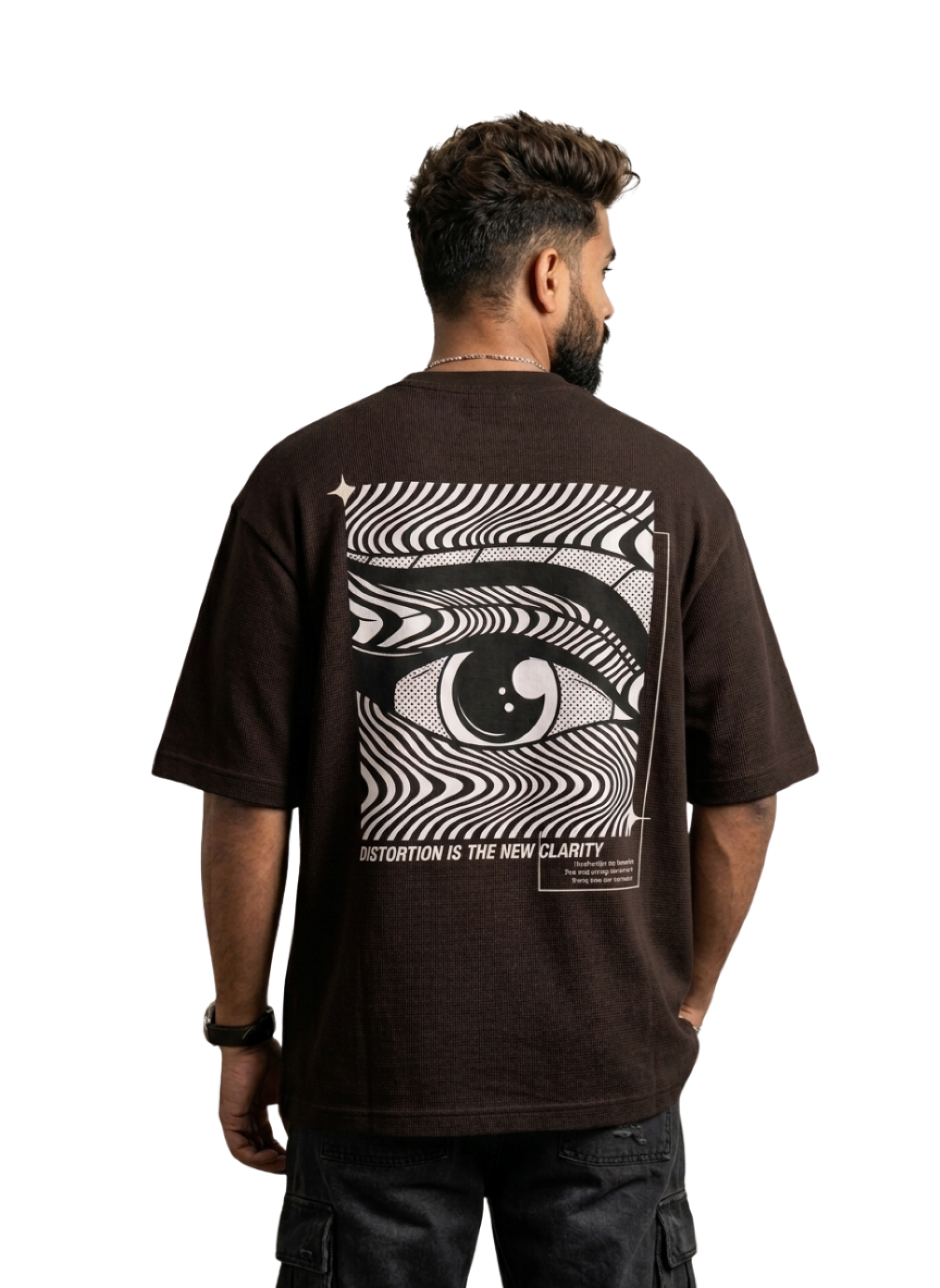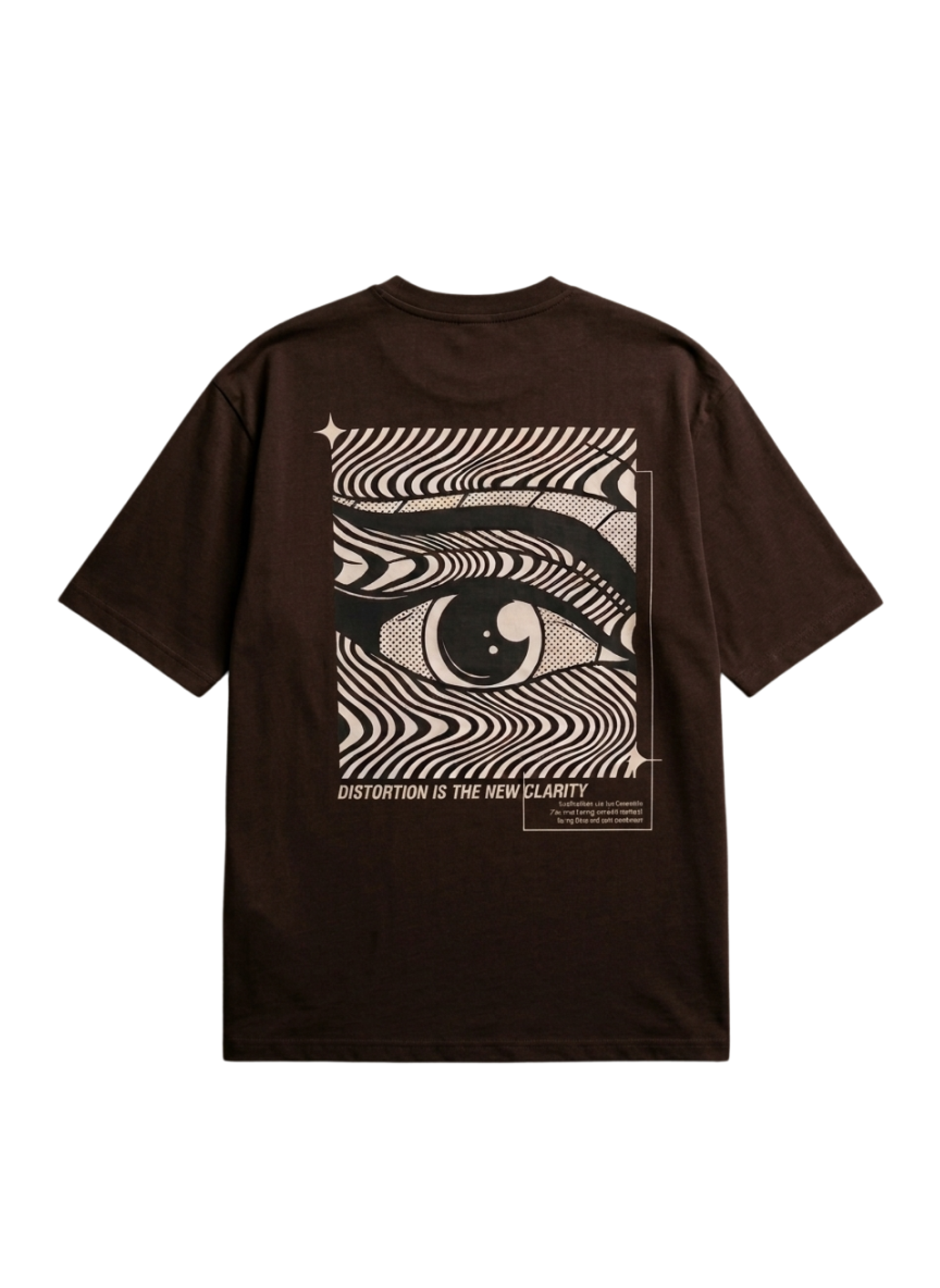 Signature "Distortion" Graphic: Features a captivating "Eye of Clarity" back-panel print with a warped, psychedelic halftone effect and the mantra: "Distortion is the New Clarity."